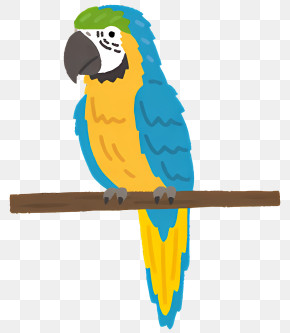 A digital illustration of a parrot perched on a tree branch. The parrot is a Scarlet Macaw, also known as a Macaw. It has a bright red body with blue and green feathers on its wings and tail. Its beak is yellow and its eyes are black. The branch it is perched on is brown and appears to be made of wood.