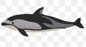 A cartoon illustration of a killer whale. The whale is shown in a side view, with its body facing towards the left side of the image. It has a large, round head with a big smile on its face, and its mouth is open wide, as if it is laughing or smiling. The body of the whale is a dark blue color, with a white stripe running down the middle of its body. Its fins are a lighter shade of blue, and it has a pointed snout.