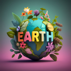 An illustration of a green globe surrounded by various plants and flowers. The globe is in the center of the image and is surrounded by red and white mushrooms with white spots. The mushrooms are arranged in a circular pattern around the globe, with some overlapping each other. The overall style of the illustration is flat and cartoon-like.