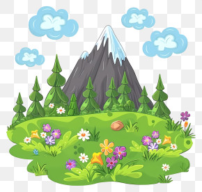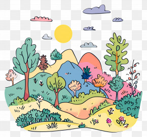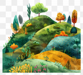 . The resolution of this PNG file is 4076 x 3772 pixels and it has a file size of 4.93 MB.An illustration of a beautiful landscape with a green hill in the background. The hill is covered in grass and there are several trees and bushes scattered throughout the scene. The sky is blue with white clouds and there is a yellow bird flying in the distance. The trees are tall and green, and the bushes are yellow and orange. There are also a few yellow flowers scattered throughout. The overall color scheme of the image is bright and cheerful, with shades of green, yellow, and blue.