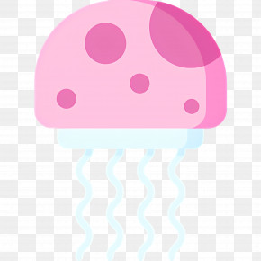A digital illustration of a pink jellyfish. The jellyfish has a round body with a pink cap that is covered in small pink dots. It has two small round eyes and a small smiley face in the center. The tentacles of the jellyfish are long and thin, and they are pink in color. The overall style of the illustration is cute and cartoon-like.