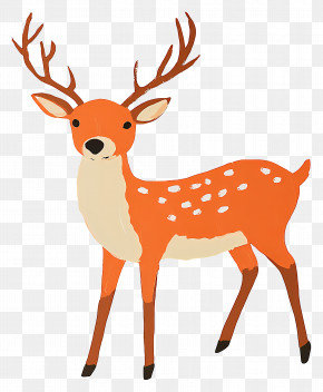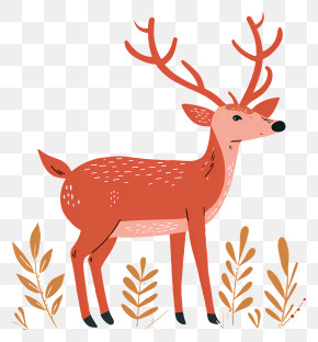A digital illustration of a deer with large antlers. The deer is facing towards the left side of the image and its head is turned slightly to the right. It has a red body with white spots on its face and neck. The antlers are long and pointed, with blue and red tips. The overall style of the illustration is cartoon-like and playful.